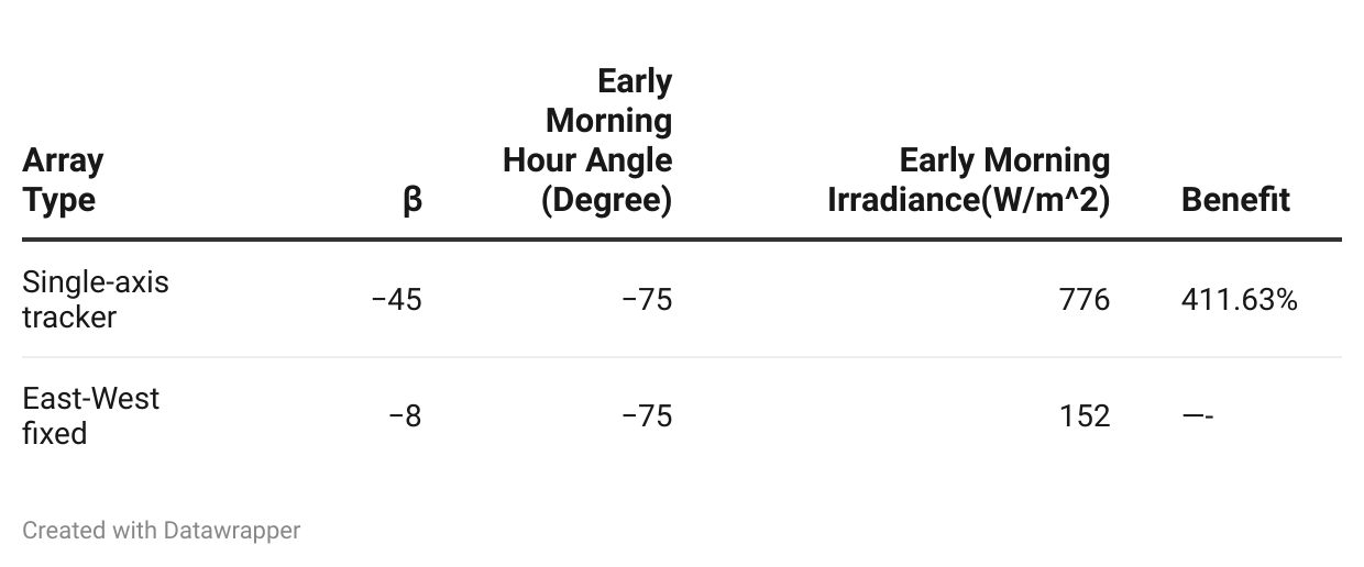 We can crudely demonstrate by approximating the panel tilt of a single-axis tracker to be approximately equal to the solar hour component $\beta\approx H$. Meanwhile, we expect to see some difference between the angle of the panel and that of the Sun in the fixed East-West array.