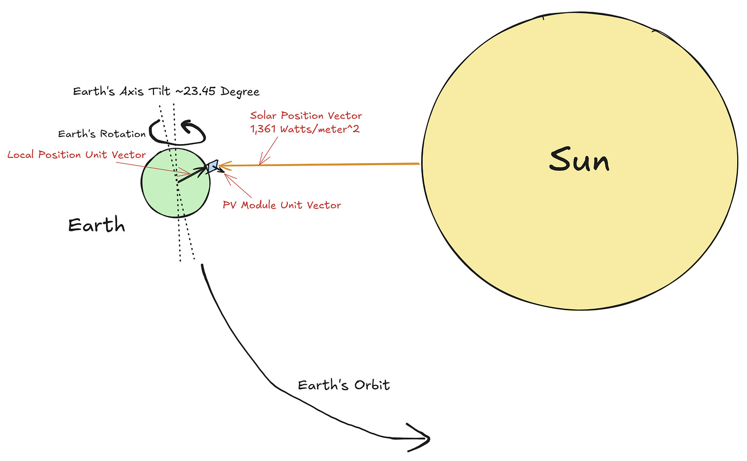 The amount of sunlight available is determined by the relationship between the local position on Earth, the orientation of the PV module, and the solar position vector, based on the relative positions of the Earth and the Sun.