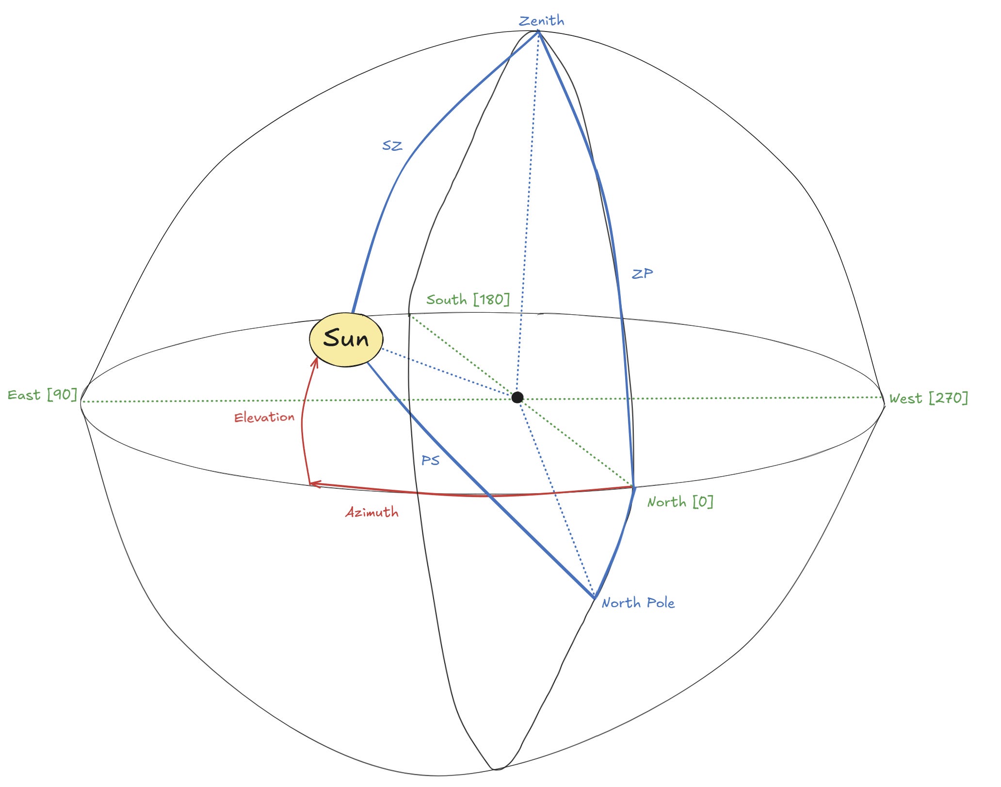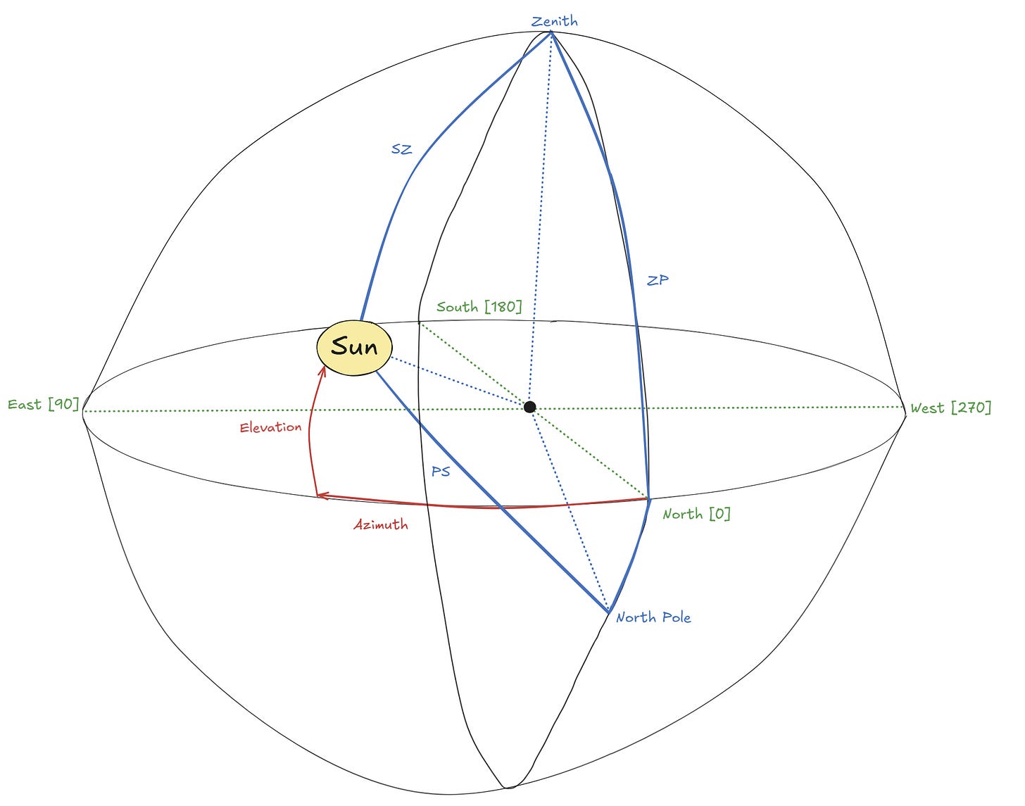 We must simplify this relationship down to the interaction of two vectors by reasoning that both the local position vector and the solar position vector can be simplified to one sunlight vector, which contains the magnitude of solar irradiance and the direction from which it approaches our location. In order to define this vector, we must find the sun’s elevation angle— the up and down component of the Sun’s position, and its azimuth angle—the map directions component (East, West, North, South). To do so, we change our reference point to our local position with a bit of spherical geometry. We relate the sunlight vector to the zenith, our local position vector projected out to the celestial sphere, and the Earth’s North Pole to understand the solar elevation and azimuth angles.