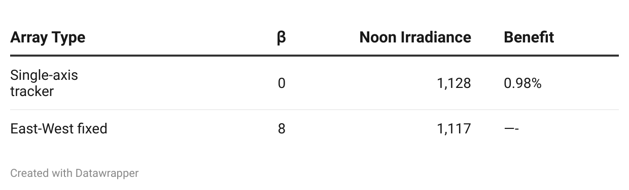 To better understand the performance difference between these two systems, it is better to simulate rather than run simple hand calcs. To see this in action, check out my blog asking if it’s time to ditch your single-axis arrays for a simpler East-West array.